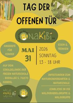Am 31.05.2026 von 13:00 - 18:00 Uhr findet der alljährliche Tag der offenen Tür des NaKiBi e. V. auf dem Schulgelände der Freien Naturschule – Badallee 5, 76870 Kandel statt. Dieser ist Träger des Naturkindergarten Bienwald und der Freien Naturschule Kandel. Interessierte sind herzlich dazu eingeladen, diesen Tag mit uns im schönen Bienwald zu verbringen und an den abwechslungsreichen Kinderangeboten teilzunehmen.