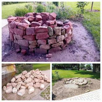Für die neue Kräuterschnecke im hinteren Parkbereich stiftete Firma Gaudier Steine und Mutterboden. Teils verwendeten die Akteure Steine der alten Schnecke wieder, teils holte Bernd Rung privat Steine über ein Inserat aus Herxheimweyher.