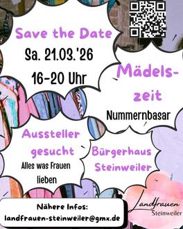 Du hast eine Leidenschaft, ein kreatives Hobby oder sogar ein eigenes Unternehmen? Dann ist die Mädelszeit die perfekte Bühne, um dich, deine Produkte oder Dienstleistungen vorzustellen. Interessierte Aussteller sind herzlich willkommen. Für mehr Informationen melde dich einfach per E-Mail an landfrauen-steinweiler@gmx.de – wir freuen uns auf vielfältige Ideen und inspirierende Stände.