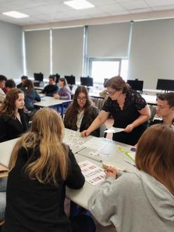 Am Vormittag arbeiteten die Jugendlichen in gemischten deutsch-französischen Gruppen in verschiedenen „ateliers“ mit unterschiedlichen Inhalten. So gab es z.B. ein Quiz zum Thema Europäische Union, es wurde das Spiel Werwölfe gespielt und in einer anderen Gruppe sollten Wörter abwechselnd pantomimisch dargestellt werden. Unter Zuhilfenahme von Händen und Füßen gelang dies den Schülern sehr schnell.