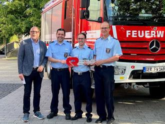 Im Beisein der Ratsmitglieder, Herrn Markus Frenzel (Fa. Rosenbauer) und den Feuerwehrangehörigen übergab Verbandgemeindebürgermeister Volker Poß symbolisch den Schlüssel an Alexander Ditz (Wehrleiter VG Kandel und Wehrführer Feuerwehr Kandel), Bastian Jung (stellv. Wehrleiter VG Kandel) und Volker Roth (stellv. Wehrführer Feuerwehr Kandel) für das neue LF 20 mit einem Gesamtwert von 448.633,57 €.