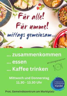 An jedem Mittwoch und Donnerstag von 11:30 – ca. 13:30 Uhr gibt es wieder leckeres Essen und nette Gesellschaft im Protestantischen Gemeindezentrum. Alle, die zum Mittagessen oder einfach auf einen kleinen Plausch und eine Tasse Kaffee vorbeikommen möchten, sind herzlich eingeladen!