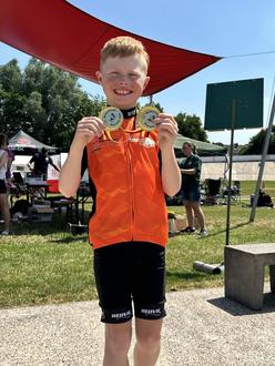 Der RV Badenia Linkenheim veranstaltete am Donnerstag, 19.06.2025, die Landesverbandsmeisterschaften Rheinland-Pfalz und Baden-Württemberg auf der Radrennbahn in Linkenheim. Für Laurin Sticha war es eine absolute Premiere, mit seinem neuen Bahnrad bei einem Radrennen zu starten. Erst seit Kurzem trainiert er mit diesem Rad. Gewöhnte sich aber schnell daran, ohne Bremse und Schaltung zu fahren. Für die Wertung der LV-Meisterschaft musste ein Zeitfahren und eine 1-er-Verfolgung bewältigt werden. Laurin gewann in beiden Disziplinen bei sehr heißen Temperaturen die LV-Meisterschaft Rheinland-Pfalz Bahn in der U13.