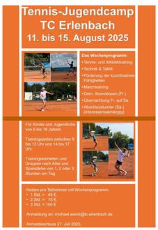 Das für den 11. bis 15. August geplante Tennis-Jugendcamp des TC Erlenbach bietet noch freie Plätze. Wir freuen uns, auch Nichtmitglieder herzlich willkommen zu heißen!