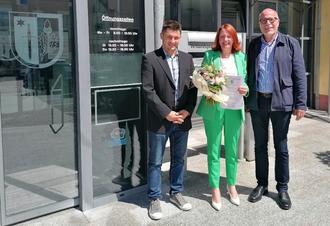 Verena Sticha zusammen mit Bürgermeister Volker Poß und dem Sachgebietsleiter „Personal“, Rainer Vollmar.