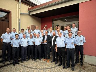 Bürgermeister Mike Schönlaub, Ortsbürgermeister Stefan Moschko, Staatssekretär Daniel Stich und die Beigeordneten der VG Kandel mit den Geehrten und der Wehrleitung der Feuerwehren der VG Kandel
