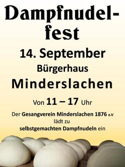 Der Gesangverein Minderslachen 1876 e.V. lädt am 14. September zum Dampfnudelfest ins Bürgerhaus ein. Lasst euch unsere leckeren selbstgemachten Dampfnudeln mit Vanille- oder Weinsauce schmecken, die mit viel Liebe und Sorgfalt zubereitet werden. Für diejenigen, die es etwas herzhafter mögen, bietet wir auch eine perfekte Kombination an: Dampfnudeln mit deftigem Gulasch.