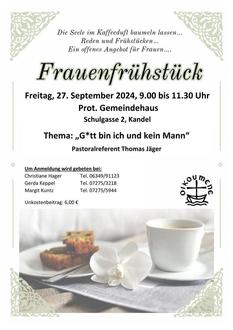 Das ökumenische Frauenfrühstück findet am 27. September 2024 von 09.00 Uhr bis 11.30 Uhr im Großen Saal des Prot. Gemeindezentrums am Marktplatz statt. Ein Kostenbeitrag von 6,00 € pro Person wird erhoben.