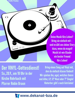 Rohrbach um 18:00 Uhr als VINYL-Gottesdienst (Pfarrer Robin Braun)! Du hast einen Song auf Vinyl, an dem du richtig hängst und den du richtig gut findest? Bring ihn mit, denn wir legen auf in der Kirche! Gerne kannst du uns sogar erzählen, warum du diesen Song oder diese Band so magst! Egal, ob alt oder neu, ob Metal, Schlager, NDW, Hiphop oder Synthpop – mehr dazu im nächsten Amtsblatt und in Social Media! Du kannst Pfr. Robin Braun in der vor dem Gottesdienst vorher mitteilen, was du mitbringst (Kontakt: s. u.), damit er etwas besser planen kann, aber auch, falls du spontan etwas im Gepäck hast, freuen wir uns – Pfr. Braun hat selbst einen großen Bestand an 70ern, 80ern und teilweise neueren Sachen auf Vinyl! Musik bedeutet Lebensgefühl und Erinnerungen – sie geht wie Gott mit uns durch das Leben und ist ein bester Freund in allen Lebenslagen, lass uns das feiern!