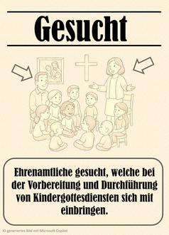 Hierfür werden Ehrenamtliche gesucht, welche bei der Vorbereitung und Durchführung von Kindergottesdiensten sich mit einbringen. Damit Kinder mit Spaß und Freude zum Glauben finden können.