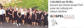 19.00 Uhr „Konzert des Chores Gospel-Train“ unter der Leitung von Johann Günther