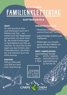 | Wenn Du zum Beispiel 13 Jahre oder älter bist, 1,65 m - 1,70 m groß, gerne sportlich unterwegs und vielleicht auch ein bisschen Klettererfahrung mitbringst, dann würden wir uns freuen, wenn du dich bei der Jugendpflege Kandel meldest. |