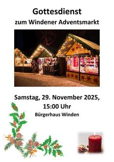 | 15:00 Uhr | Gottesdienst zum Windener Adventsmarkt, Bürgerhaus Winden (Prädikantin Cornelia Dreisigacker) |