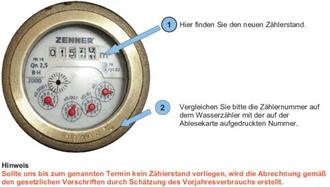 Bitte teilen Sie uns Ihren Zählerstand auch dann mit, wenn der Wasserzähler unmittelbar vor Ihrer Ablesung vom Wasserwerk noch getauscht wurde. Durch Zeitüberschneidung zwischen Druck und Versand der Ablesemitteilung und dem Tausch der Wasserzähler können aufgedruckte Daten nicht mehr mit Ihrem aktuellen Wasserzähler übereinstimmen.