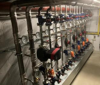 Die neu installierte Leitungssystem mit Verteiler, Vorlauf, Rücklauf, Regelungen und Pumpen