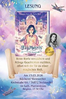 Wer hat Lust, sich mit uns auf eine magisch-musikalische Lesereise zu begeben? Klingt ein Ausflug in die zauberhafte Welt des Mädchens Fay Melody, in der viele aufregende Klang-Abenteuer auf uns warten nicht äußerst verlockend? Am Freitag, den 13.03.2026 wird uns die Hagenbacher Autorin Anastasia Braun besuchen und aus ihrem neuesten Werk „Fay Melody - Die magische Musikakademie“ vorlesen. In gemütlicher Atmosphäre werden sicher alle Kinder ab der 4. Klasse, die spannende Erzählungen lieben, auf ihre Kosten kommen. Und Musik mag schließlich jeder, stimmt’s? Kommt also gerne vorbei und lasst euch ein wenig verzaubern. Los geht’s um 17:30 Uhr, der Eintritt ist frei. Wir freuen uns schon sehr darauf, gemeinsam mit euch der wunderschönen Geschichte aus Frau Brauns Feder zu lauschen.