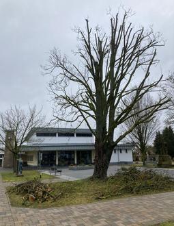 Auf der Zielgeraden der diesjährigen Schneidarbeiten wurde auf dem Vorplatz der Friedhofshalle der prächtige Spitzahorn zurückgeschnitten, insbesondere wurde dort von einer beauftragten Fachfirma Totholz entfernt, das bei der Baumkontrolle festgestellt wurde. Bereits vor zwei Jahren erfolgten an diesem Baum umfangreiche Schneidarbeiten, so wurde die Baumkrone deutlich zurückgeschnitten, nachdem eine Standfestigkeitsanalyse die Standfestigkeit und Vitalität des Baumes bescheinigte - und der Baum somit nicht gefällt werden musste.