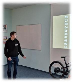 Luca Hellwig referierte anschließend über „Freeride Fully, Hightech oder Sportgerät Ein Freeride Fully ist ein vollgefedertes Fahrrad. Es gibt fünf Arten von Fullys, abhängig von der Länge des Federweges. Man bekommt sie ab 2500 Euro, nach oben hin gibt es eigentlich keine Grenze. Luca erläuterte am Beispiel seines eigenen Fullys die Komponenten (Federgabel und Dämpfer, Bremsen, Reifen Schaltung und Rahmenform und -material). Er zeigte, dass es faszinierend ist, wie so viel kleine Teile auf einander abgestimmt reagieren. Sein Fazit: ein Freeride Fully ist sowohl Sportgerät als auch ein Hightech Produkt.