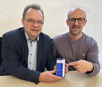 Die Schwalm-Eder-Kreis-App ist da und ab sofort in den gängigen App-Stores verfügbar: Landrat Winfried Becker und Julian Klagholz (Presse- und Öffentlichkeitsarbeit des Landkreises) freuen sich über den Start. (Bildautor: Stephan Bürger | Kreisverwaltung Schwalm-Eder)