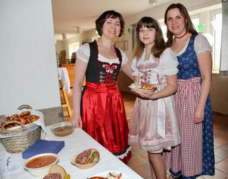 Im feschen Dirndl kredenzen Olga Persch, Elena Kraft und Irene Kraft bayerische Spezialitäten