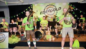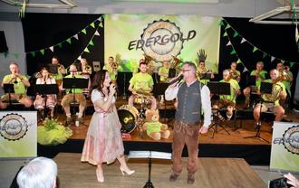 Ganz im Zeichen der Blasmusik stand das Wochenende in Wolfershausen. Die Musiker der Kapelle Edergold stellten ihr neues Programm „Freundschaft ist EderGOLD“ vor. Dabei erlebten die 200 begeisterten Zuschauer auch eine Uraufführung. Die Polka „Ein Tag mit dir“, komponiert von Oliver Steer und arrangiert vom musikalischen Leiter von Edergold, Till Borchert, erklang zum ersten Mal. Dieses Stück gibt es nur von Edergold. Aber nicht nur mit dieser Polka, sondern mit der gesamten Titelauswahl hatten die Organisatoren den Geschmack des Publikums getroffen. Die Blasmusiker spielten viele Stücke von Ernst Mosch, aber auch neue Arrangements wurden gespielt. Mit Witz, Charme und Wissen führten Melanie Vockeroth und Marco Wunsch gekonnt durch das Programm.