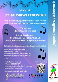 Der 22. Jugendmusikwettbewerb der Stadt Borken (Hessen) findet in Kooperation mit der Musikschule Schwalm-Eder e. V. am Samstag, 24. Mai 2025, statt.