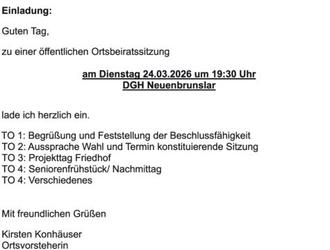 Sitzung des Ortsbeirates Neuenbrunslar am 24.03.2026