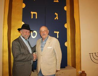 Herzlichen Dank: Christopher Willing, links, Vorsitzender des Vereins zur Rettung und zum Erhalt der Synagoge in Felsberg, und Spender Uwe Cornelius Lengen. Er erhielt 4200 Euro von den Gästen seines 85. Geburtstages. Foto: Manfred Schaake