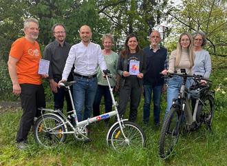 (v. li.) Ulrich Wüstenhagen (Kreisvorsitzender ADFC), Christian Utpatel (ADFC Kreisverband), Stefan Cichosz (Nahmobilitätskoordinator), Korinna Jäger (Leiterin Straßenverkehrsbehörde), Tatjana Grau-Becker (Fachbereichsleiterin Wirtschaftsförderung), Jochen Böhme-Gingold (ADFC Kreisverband), Annika Burghardt (Rad- und Wanderwegebeauftragte) und Edith Bussmann-Erler (ADFC Kreisverband) (Bildautor: Julian Klagholz | Kreisverwaltung Schwalm-Eder)