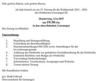Einladung zur Ortsbeiratssitzung in Gensungen