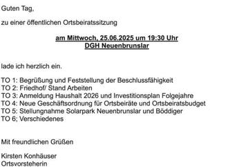Einladung zur Sitzung des Ortsbeirates Neuenbrunslar am 25.06.2025