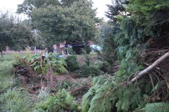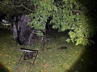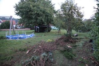 Die Polizei hatte die Einsatzkräfte angefordert, denn nach einem Verkehrsunfall in der Emstalstraße waren die Fahrzeuginsassen verschwunden. Nach Polizeiangaben war ein, anhand der Spuren mit vermutlich zwei Personen besetzter, E-Mercedes GLC in einer Rechtskurve kurz vor dem Ortseingang geradeaus gefahren. E verursachte dabei eine etwa 120 Meter lange Trümmerstrecke von der Straße bis zur Aufschlagstelle. Der Pkw fuhr ungebremst durch einen Straßengraben und dann die Böschung hoch durch eine über drei Meter hohe Tujahecke. Anschließend walzte er Büsche und Bäume nieder, beschädigte einen Gartenpool und Gartenmöbel und krachte dann gegen den Stamm eines massiven Kirschbaumes. Dadurch wurde das Fahrzeug auf die Seite geschleudert. Der Mercedes blieb total zerstört neben dem Baum auf der Beifahrerseite liegen. Nur wenige Meter weiter befindet sich ein gastank.
