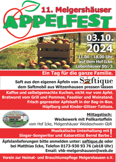 Am 3. Oktober geht es in Melgershausen wieder um die Äpfel. Der Verein zur Heimat- und Brauchtumspflege hat zum Appelfest auf Icken Hof in der Lobenhäuser Straße eingeladen. Da der Behang der Apfelbäume in der Gemarkung Melgershausen sehr unterschiedlich ist lädt der Verein auch neben den Mitbewohnern Auswärtige ein, ihre Äpfel zum Pressen nach Melgershausen zu bringen. Laut Vereinsvorsitzendem Matthias Icke sind an vielen Bäumen keine Äpfel reif geworden, an einigen wenigen Bäumen, hängen Äpfel, aber insgesamt ist der Ertrag der Bäume nicht gut.