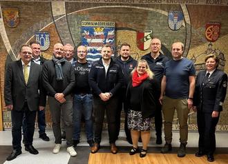 von links: Landrat Winfried Becker, Dr. Hartmut Lotz - Ärztlicher Leiter Rettungsdienst, Thomas Schröder - Leitender Notarzrt (LNA), Uwe Wunsch - stellv. Fachbereichsleiter Brand-, Katastrophenschutz u. Rettungswesen, Pascal Steil - Organisatorsicher Leiter Rettungsdienst (OLRD), Constatntin Mühr - OLRD, Marius Damm - OLRD, Kathrin Häfele - LNA, Helge Stuhlmann - OLRD, Benjamin Reitz - OLRD, Tanja Dittmar - Kreisbrandinspektorin