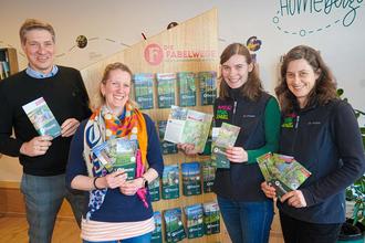 Freuen sich über die neuen Fabelwege-Flyer (v.l.n.r.): Vorsitzender des Zweckverbands Knüllgebiet/Naturparks Knüll sowie des Tourismusservice Rotkäppchenland und Bürgermeister der Stadt Homberg (Efze) Dr. Nico Ritz, Mitarbeiterin des Rotkäppchenlands Mareike Urbanek, Mitarbeiterin des Naturparks Knüll Judith Walz, Geschäftsführerin des Naturparks Katrin Anders © Sascha Hoffmann Foto frei mit dieser PM