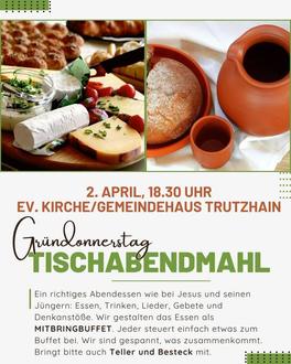 An Gründonnerstag, 2. April, veranstalten wir um 18:30 Uhr in der Ev. Kirche Trutzhain ein richtiges Abendessen wie bei Jesus und seinen Jüngern: Essen, Trinken, Lieder, Gebete und Denkanstöße. Wir gestalten das Essen als Mitbringbuffet. Jeder steuert einfach etwas zum Buffet bei. Wir sind gespannt, was zusammenkommt. Bringen Sie bitte auch Teller und Besteck mit. Eingeladen sind alle aus den Gemeinden an der Steinafurt und auch gerne darüber hinaus.