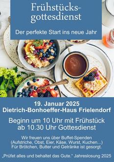 Wir laden alle, groß und klein, jung und alt, herzlich zum Frühstücksgottesdienst am Sonntag, den 19. Januar in Frielendorf ins Dietrich-Bonhoeffer-Haus ein. Beginn ist um 10 Uhr. Wir freuen uns darauf, mit euch gemeinsam einen inspirierenden Morgen zu verbringen.