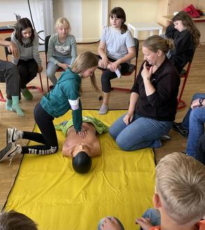 Alle Schüler und Schülerinnen bekamen außerdem die Möglichkeit, an der Puppe die Reanimation zu üben. Das war ziemlich anstrengend!