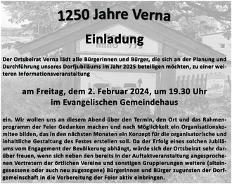 Hiermit lade ich den Ortsbeirat des Ortsbezirks Verna gemäß § 82 Abs. 6 i. V. m. § 58 HGO zu einer öffentlichen Sitzung am Freitag, dem 2. Februar 2024, um 19.00 Uhr im Evangelischen Gemeindehaus ein.