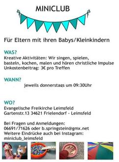 | 09.30 Uhr | Mini-Club für Kleinkinder und Eltern |