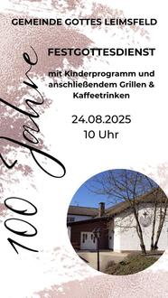 | 10.00 Uhr | Jubiläums-Festgottesdienst 100 Jahre Gemeinde Gottes in Leimsfeld |