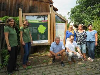 Die neue Informationstafel des Naturparks Knüll in Alheim-Oberellenbach (von l. n. r.: Katrin Anders (Geschäftsführerin Naturpark), Judith Walz (Mitarbeiterin Naturpark), Lutz Wildenhayn (Vorsitzender Heimatverein Ellenbach), Dr. Andreas Brethauer (Bürgermeister), Antonia Martens (Tourismus-Service Erlebnisregion Mittleres Fuldatal), Regina Zimmermann (Ortsvorsteherin) und Kerstin Wagner (stellv. Ortsvorsteherin) © Gemeinde Alheim
