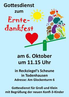 Begrüßungsgottesdienst am 6. Oktober um 11.15 Uhr im Erntedankgottesdienst in Reckziegels Scheune, Am Glockenturm 6 in Todenhausen. Bitte zum Gottesdienst Euer Lieblingsobst/Lieblingsgemüse mitbringen.