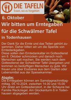 Gerne können auch schon am Samstag Erntegaben zum Gottesdienstort gebracht werden, die am Erntedankfest den Dankaltar schmücken und danach der Schwälmer Tafel übergeben werden (Siehe oben)