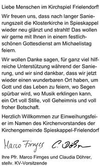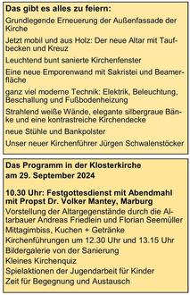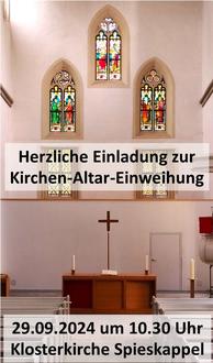 | 10.30 Uhr | Kirchspiel-Festgottesdienst zur Kirchen-Altar-Einweihung in der Klosterkirche Spieskappel mit anschließendem Mittagsimbiss und Kirchenführungen |
