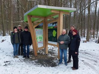 Am Wildpark Knüll wurde ein neuer Naturpark-Infopoint eingeweiht. V.l.n.r.: Judith Walz (Naturpark Knüll), Wolfgang Fröhlich (Wildpark Knüll), Jürgen Kaufmann (Erster Kreisbeigeordner Schwalm-Eder-Kreis), Jürgen Schäfer (Landkreis Hersfeld-Rotenburg), Dr. Nico Ritz (Vorsitzender Zweckverband Knüllgebiet/Bürgermeister Stadt Homberg (Efze)), Katrin Anders (Naturpark Knüll) © Sara Engelbrecht