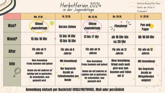 Das Büro in der Jugendetage ist vom 14.10 bis 20.10. nicht besetzt. Anmeldungen können daher telefonisch nicht entgegen genommen werden.