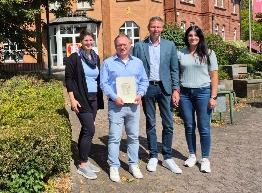 v.l.n.r.: Vorsitzende des Personalrats Christin Heipel, Jubilar Torsten Waldeck, Bürgermeister Jens Nöll, Vorsitzende der Betriebsgemeinschaft Silvia Kalb