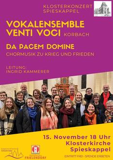 Das Vokalensemble Venti Voci des Kirchenkreises Twiste-Eisenberg ist am Samstag, dem 15. November 2025, um 18 Uhr zu einem besonderen Konzert in der Klosterkirche Spieskappel zu Gast. Unter dem Titel „Da Pacem Domine – Gib Frieden, Herr“ erklingen Chorwerke, die sich in eindrucksvoller Weise mit dem Thema Krieg und Frieden auseinandersetzen.