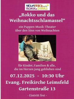 | 10.30 Uhr | Gottesdienst mit Puppen-Musik-Theater mit Helmfried Dege:„Rokko und das Weihnachtsschlamassel“ |